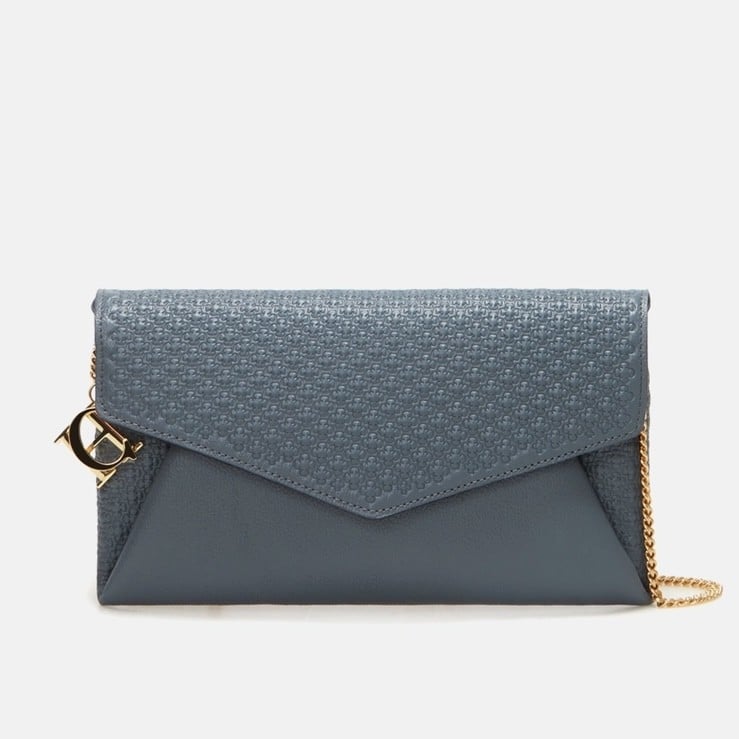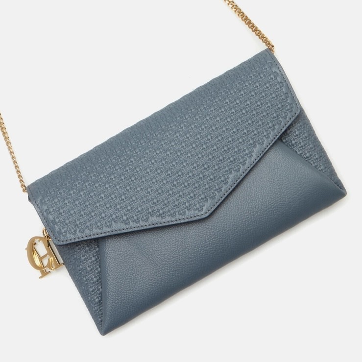 محفظة مصنوعة يدويًا من جلد سيكويا ، مع حبيبات عادية ، تتميز بختم Rosetta Insignia المنقوش وسحر مطلي بالذهب مع الأحرفالأولى من Carolina. منتهية بحزام سلسلة ، يمكن ارتداؤها عبر الجسم.
